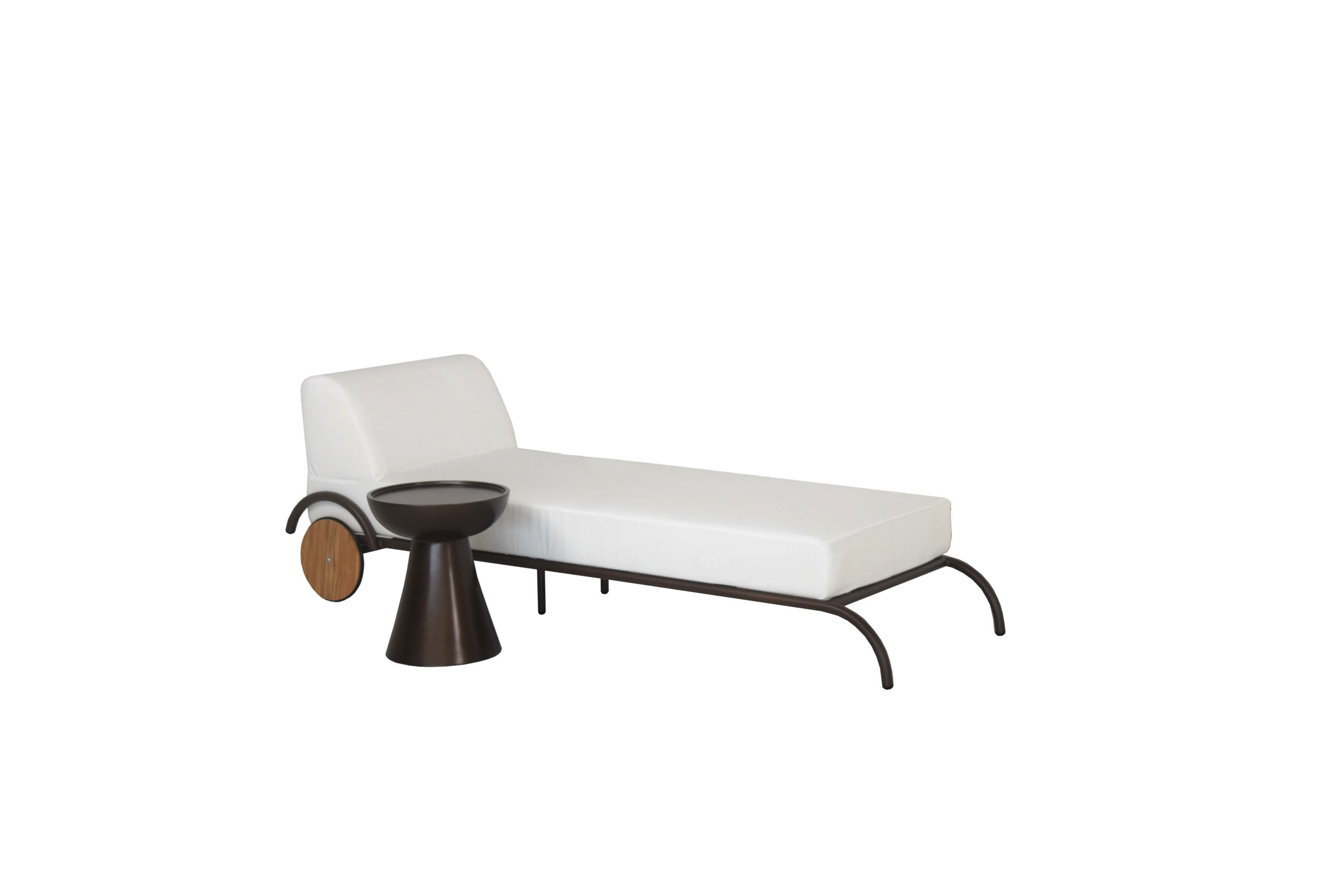 Designed for ultimate outdoor comfort, Flow includes a padded waterproof cushion, ensuring a plush lounging experience in all weather conditions. The rotating wooden wheels add both functionality and elegance, making it easy to move and reposition for the perfect sun-soaked moment.